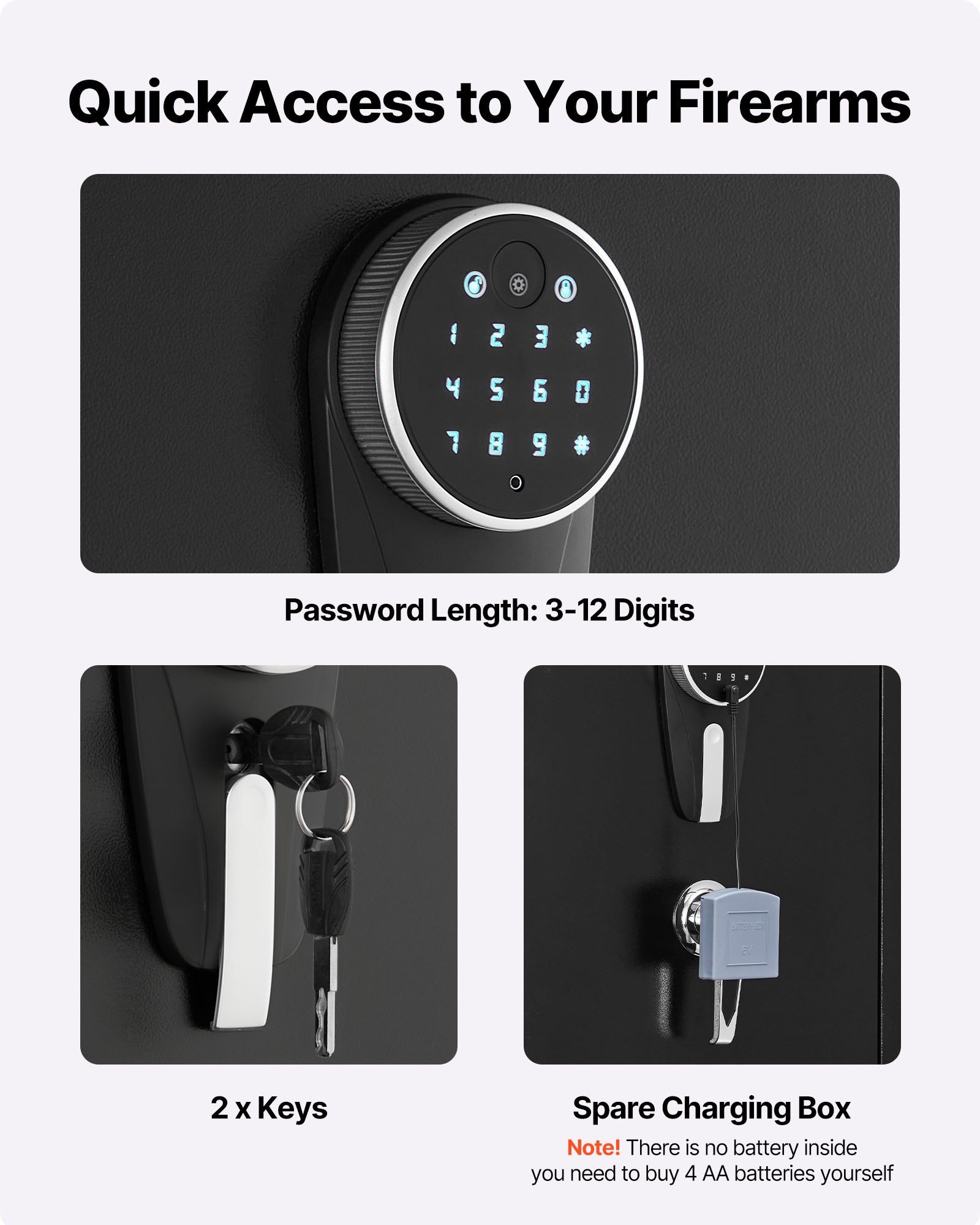 2.Smart Lock: The 9-digit touchscreen password lock provides quick access. The password can be set between 3-12 digits, with an auto-lock function for added security. It also includes an emergency key and spare charging box for easy unlocking during battery depletion. (Note: There is no battery inside, you need to buy 4 AA batteries separately.)