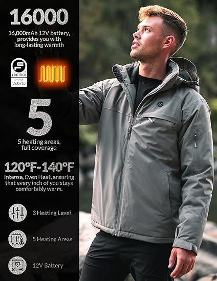 Heated Jacket, Ski Jacket Coat, With 12V/16000mAh Battery Pack, 5 Areas Heating Thicken Men Winter Coat